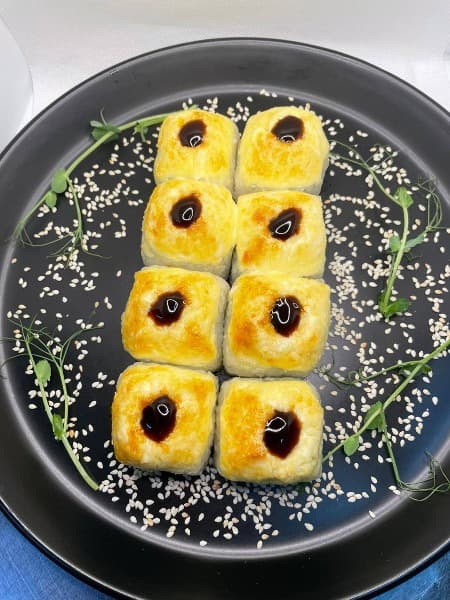 нори, рис, салат айсберг, сырный соус, сливочный сыр, унаги соус, курица.